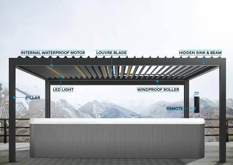 Grâce à sa technologie innovante, la pergola est équipée de persiennes motorisées, contrôlables via télécommande, ainsi qu'un éclairage LED intégré qui vous permet de moduler l’ambiance et la luminosité selon vos envies. Sa construction en aluminium 100 % (6063-T5) avec un revêtement en poudre assure une durabilité exceptionnelle, tout en offrant un design élégant et résistant aux intempéries. 24